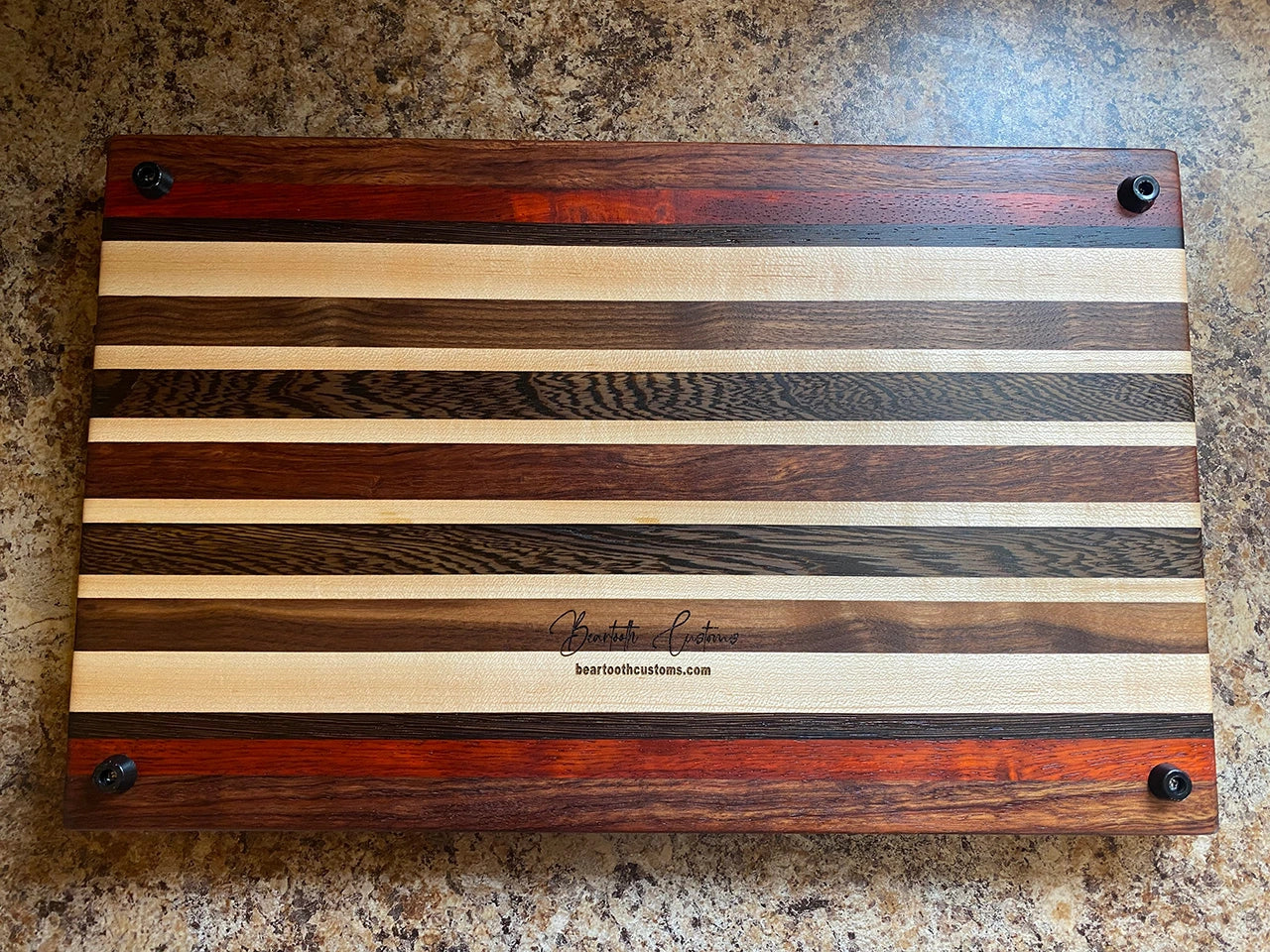 Our Exotic Plus line of butcher block cutting boards have been updated and are made from combination of exotic Wenge, Padauk, Bubinga and/or Purple Heart woods then finished off with domestic sourced walnut and hard curly maple. You get to pick your woods and board layout. I will send you pics and you can make adjustments to layouts and wood thicknesses before actual glue up to truly make this board your own. Every board comes with rubber feet to help prevent warping.